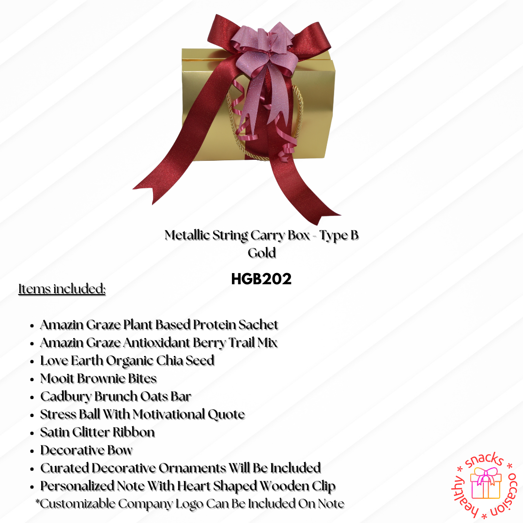 The Healthy Gleam Gift Box is a luxurious and wellness-inspired corporate gift designed to impress with its elegant presentation and thoughtful selection of healthy snacks and uplifting items. Each box comes in a Metallic String Carry Box with two style options and three stunning color variations: Rose Gold, Gold, and Silver. These boxes make a chic, sophisticated statement while promoting well-being and positivity in the workplace or as a thoughtful gift for clients or employees.