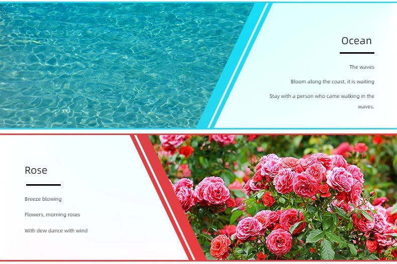 Fragrance: Ocean,Rose aromatherapy essential oil, lily aromatherapy essential oil, mint aromatherapy essential oil, white tea aromatherapy essential oil, sweet orange aromatherapy essential oil, jasmine aromatherapy essential oil, freesia aromatherapy essential oil, marine aromatherapy essential oil, osmanthus aromatherapy essential oil, cherry blossom aromatherapy essential oil, sandalwood aromatherapy essential oil, lavender aromatherapy essential oil, lemon aromatherapy essential oil, vanilla aromatherapy essential oil, ylang-ylang aromatherapy essential oil