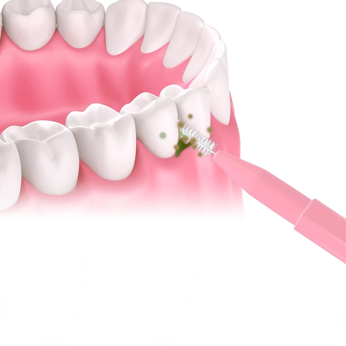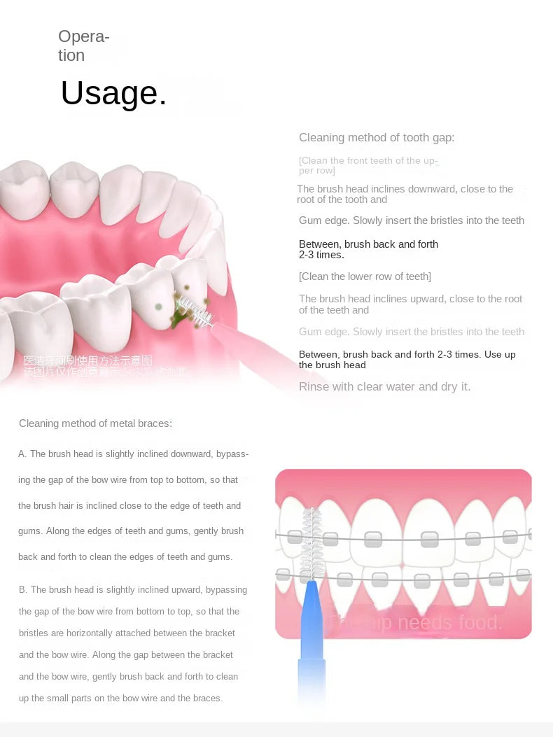 Place the interdental brush on the teeth and slowly move the brush back and forth on the dental gap so as to remove the food debris between the teeth.